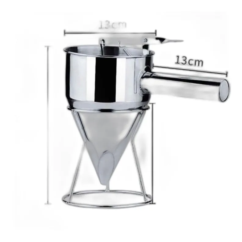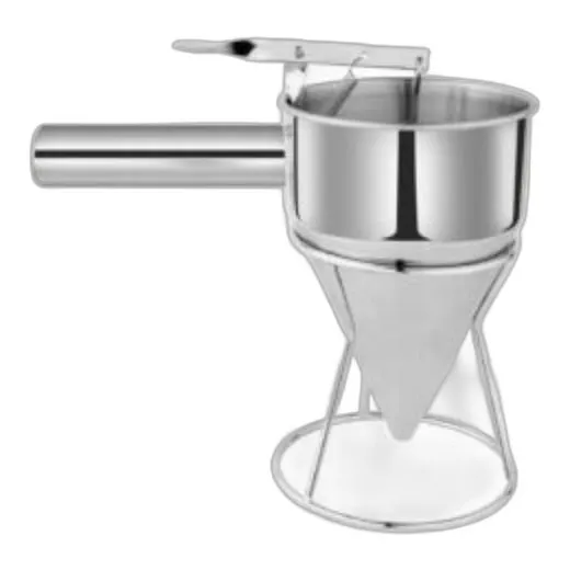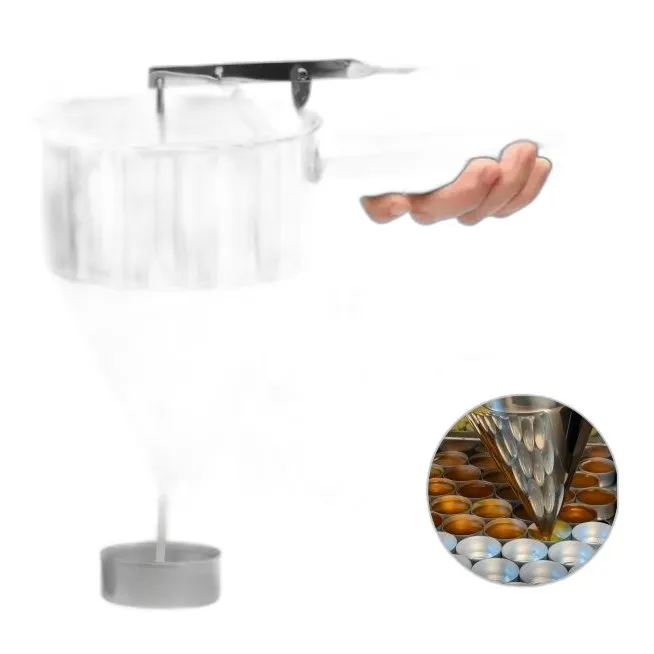 Precyzyjny lejek dozownik z metalu, przeznaczony do porcjowania wosku podczas produkcji świec. Pojemność 1,2 litra ułatwia kontrolowane napełnianie form, zapewniając czystość i efektywność pracy.