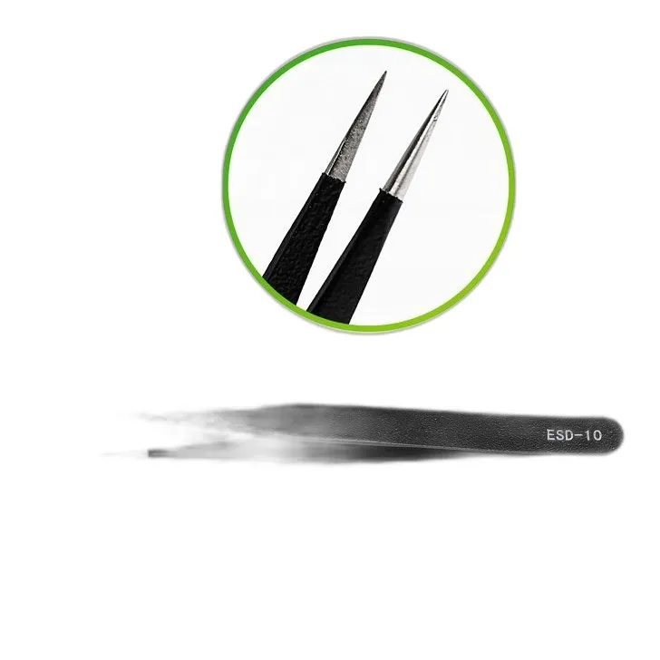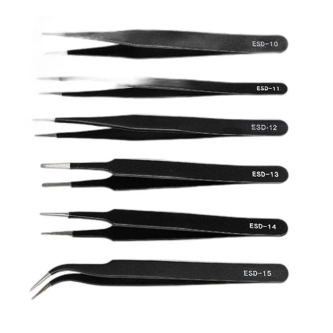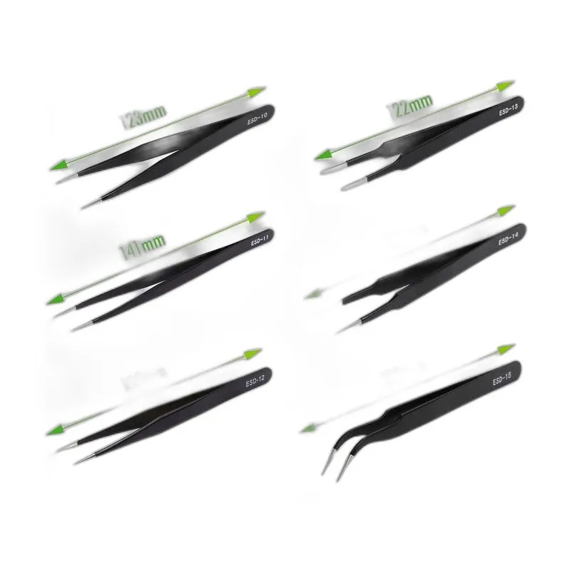 Profesjonalny zestaw sześciu metalowych pęset antystatycznych (ESD) do precyzyjnej pracy z drobnymi elementami. Wykonane z wysokiej jakości materiału, zapewniają trwałość i skuteczną ochronę przed ładunkami elektrostatycznymi.